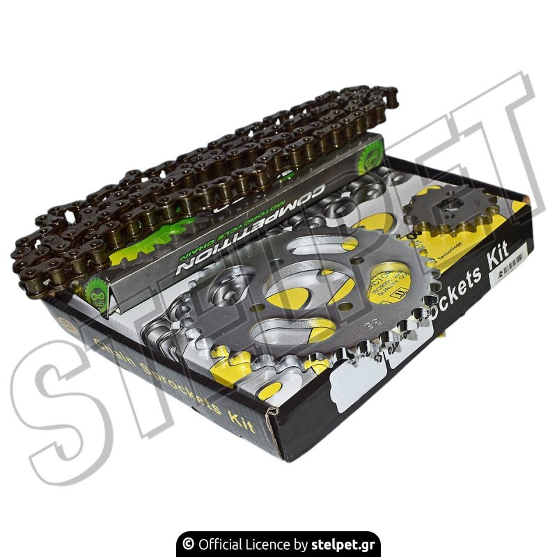 Το σετ περιλαμβάνει μπροστινό γρανάζι κίνησης 14 δόντια, πίσω γρανάζι κίνησης 35 δόντια και αλυσίδα κίνησης 428 x 102.