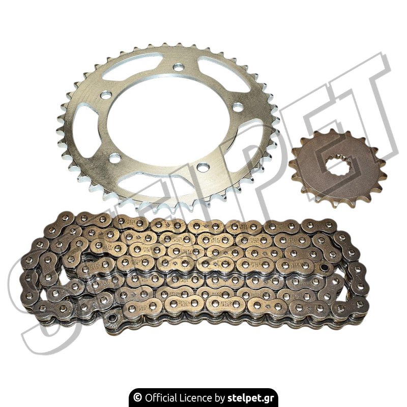 Το σετ περιλαμβάνει αλυσίδα κίνησης 525OR x 112, εμπρός γρανάζι κίνησης 17 δόντια και πίσω γρανάζι κίνησης 42 δόντια.