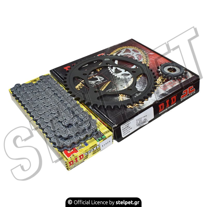 ► Το σετ περιλαμβάνει μπροστινό γρανάζι κίνησης 15 δόντια και πίσω γρανάζι κίνησης 47 δόντια από την εταιρεία JT, ενώ η αλυσίδα είναι 525VX x 118.