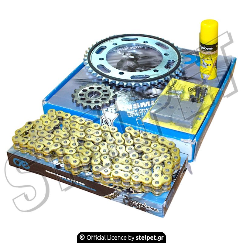 Η συσκευασία περιλαμβάνει μπροστινό γρανάζι κίνησης 16 δοντιών, πίσω γρανάζι κίνησης 43 δοντιών με τσιμούχα για ελαχιστοποίηση του θορύβου, χρυσή αλυσίδα 525-H-SO 114, σπρέι λίπανσης αλυσίδας της εταιρείας Ognibene και κιτ τοποθέτησης της αλυσίδας.