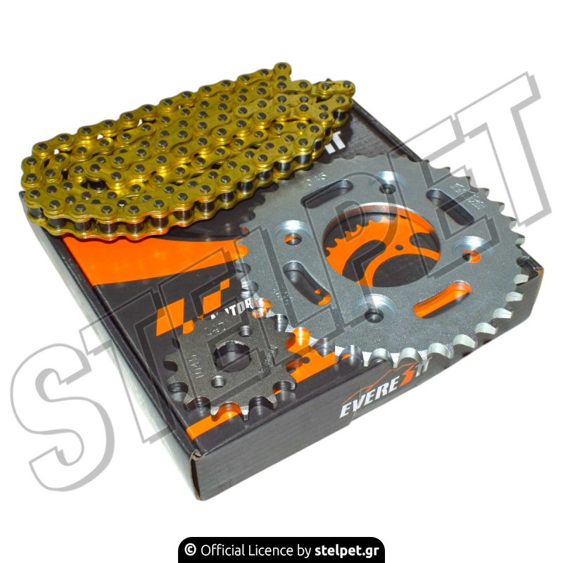 Το σετ περιλαμβάνει χρυσή αλυσίδα κίνησης 428-104, γρανάζι κίνησης εμπρός με 14 δόντια και γρανάζι κίνησης πίσω με 35 δόντια.