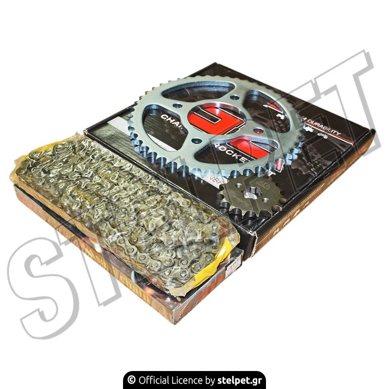Το σετ περιλαμβάνει αλυσίδα κίνησης 428 x 130, εμπρός γρανάζι κίνησης 15 δόντια και πίσω γρανάζι κίνησης 48 δόντια.