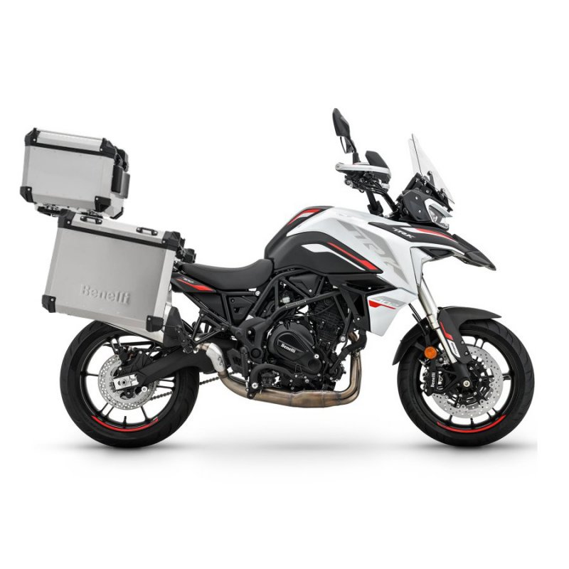 Μοτοσυκλέτα TRK702 σε λευκό χρώμα με βάσεις και βαλίτσες από την εταιρεία BENELLI.