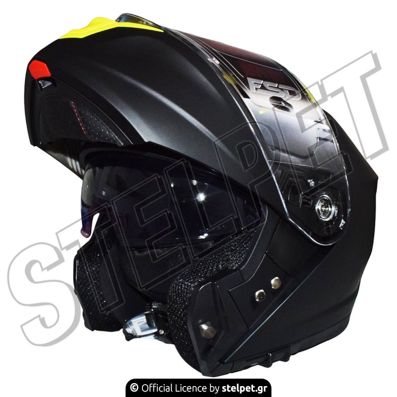 Κράνος flip up YA-967 DV με πιστοποίηση ECE 22.06 σε μαύρο ματ χρώμα και κίτρινους αεραγωγούς από την εταιρεία FSD .