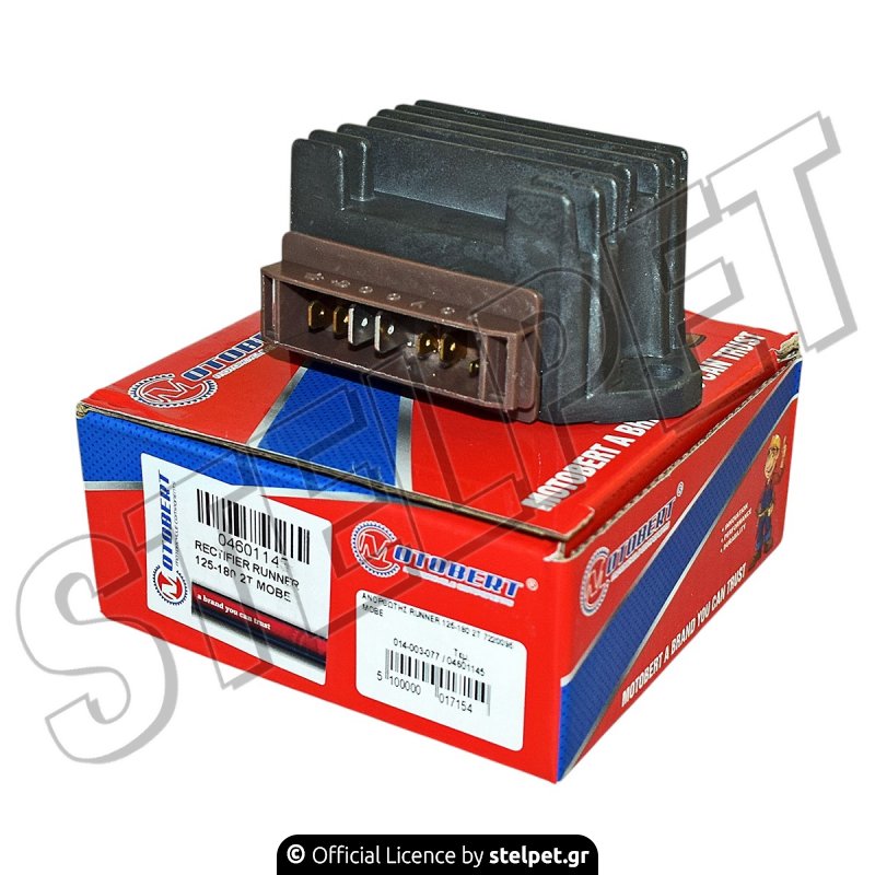Ανορθωτής Gilera Runner 125-180 2Τ από την εταιρεία Motobert – αξιόπιστη επιλογή για την αποκατάσταση και σωστή λειτουργία του ηλεκτρικού συστήματος του scooter σας. Κατασκευασμένος με υψηλής ποιότητας υλικά, προσφέρει σταθερή απόδοση και προστασία του συστήματος φόρτισης από υπερτάσεις. Ιδανικός για αντικατάσταση του εργοστασιακού ανορθωτή, με συμβατότητα για τα μοντέλα Gilera Runner 2Τ 125cc και 180cc.