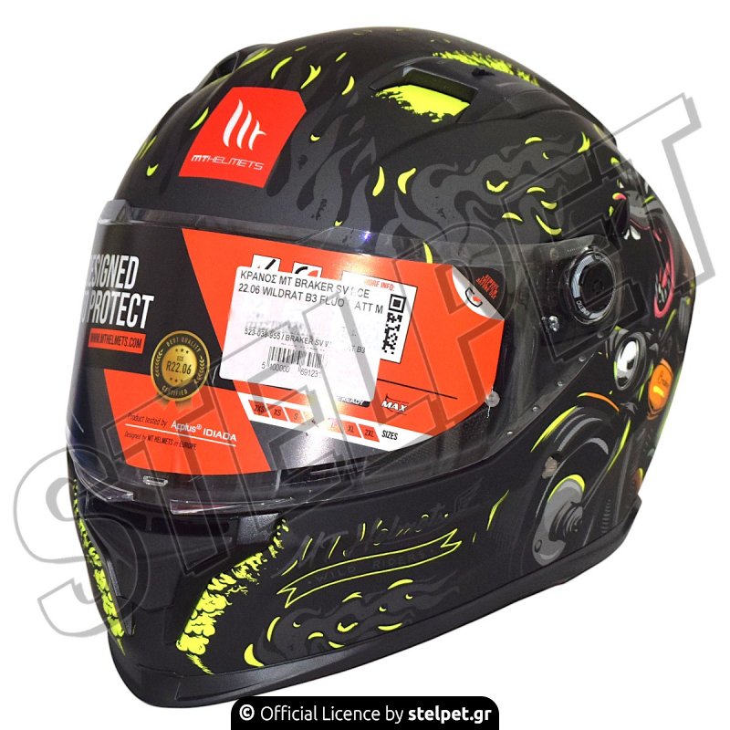 Κράνος full face Braker Wildrat B3 σε μαύρο ματ και fluo κίτρινο χρώμα από την εταιρεία MT με πιστοποίηση ECE22.06.