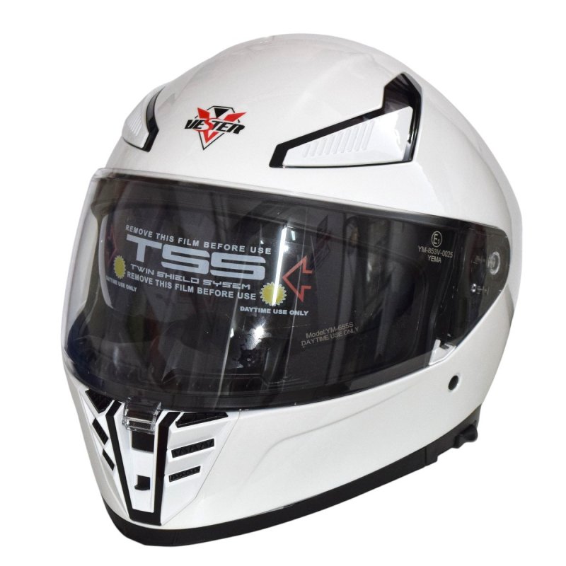 Κράνος Full Face Vester YM-853 σε λευκό χρώμα, πιστοποιημένο με ECE 22.06, προσφέρει μέγιστη ασφάλεια, άνεση και μοντέρνο σχεδιασμό για κάθε αναβάτη.